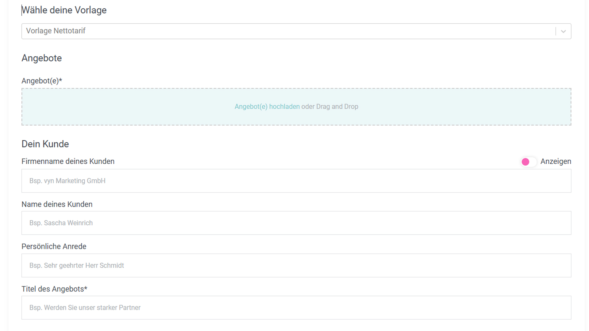Ergänze ein paar Daten in der Vorlage und wenn du willst, erklärst du dein Angebot im Video und nimmst ein Begrüßungsvideo auf. Du generierst einen Angebots-Link und schickst den an den Kunden.